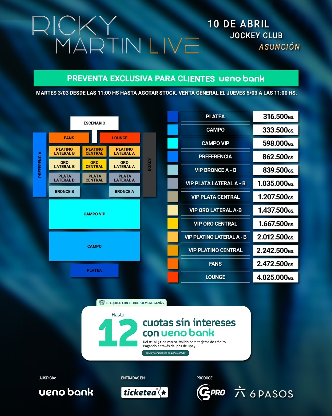Se habilitará PREVENTA EXCLUSIVA para clientes de tarjetas de crédito ueno el martes 03 de marzo desde las 11:00 h. en todos los puntos de TICKETEA y a través de www.ticketea.com.py con costos desde Gs. 250.000. En lo que respecta a la venta general, esta iniciará el jueves 05 de marzo a partir de las 11:00 h. Cabe destacar que clientes de tarjetas de crédito ueno podrán acceder a beneficios también durante la venta general.